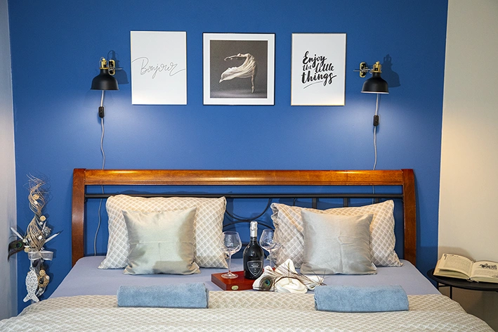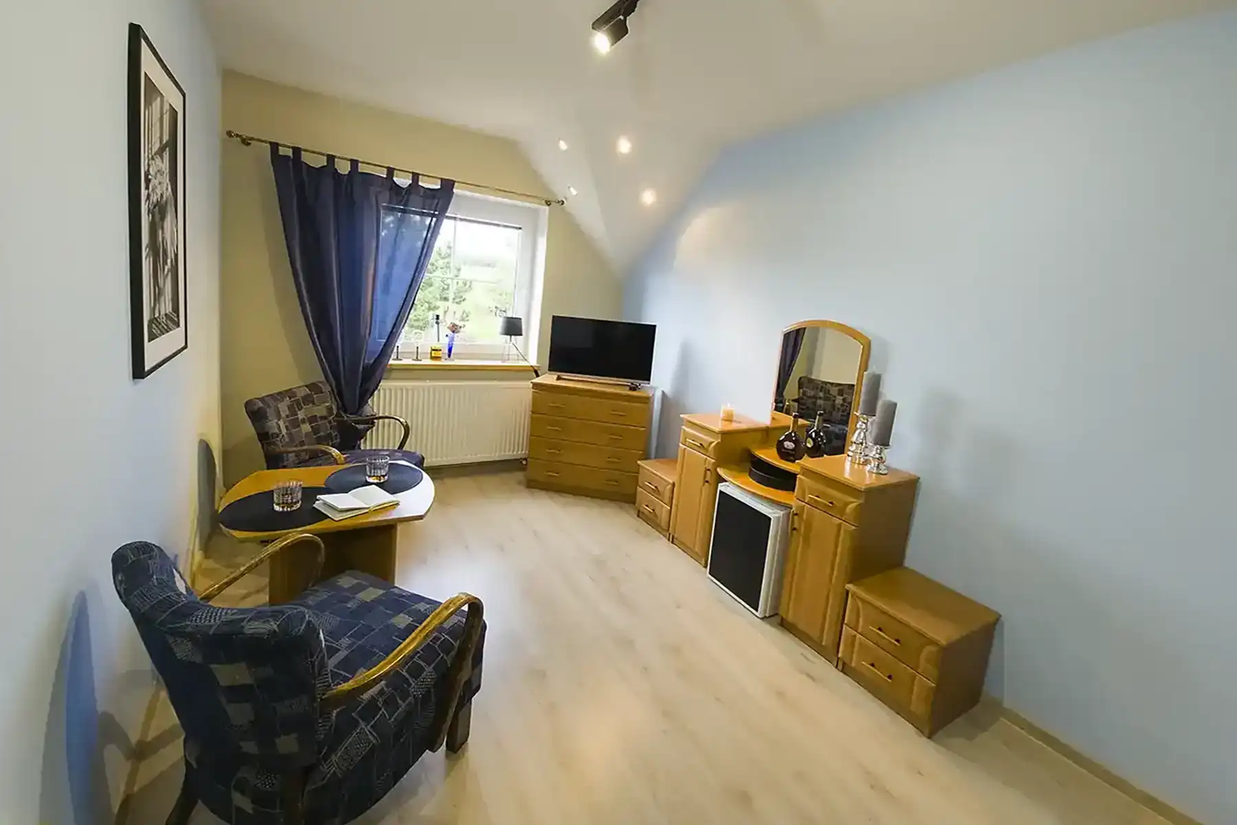 Díky modernímu vybavení a prostornému interiéru je Modrý pokoj ideální pro páry nebo jednotlivce hledající útěk do přírody. Užijte si relaxaci v pohodlné posteli, s výhledem na okolní přírodu nebo odpočinek po dni plném objevování krásných Broumovských stěn.