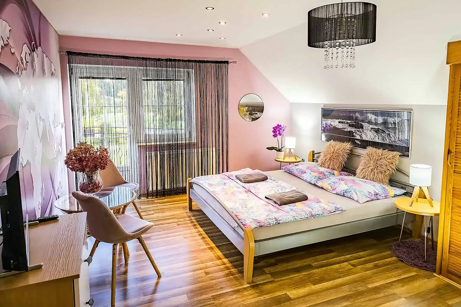 Zažijte kouzlo Růžového pokoje ve Vile Marcelka, kde elegance potkává pohodlí. Tento stylový pokoj v jemných růžových odstínech nabízí útulné ubytování s nádherným výhledem na Broumovské stěny.